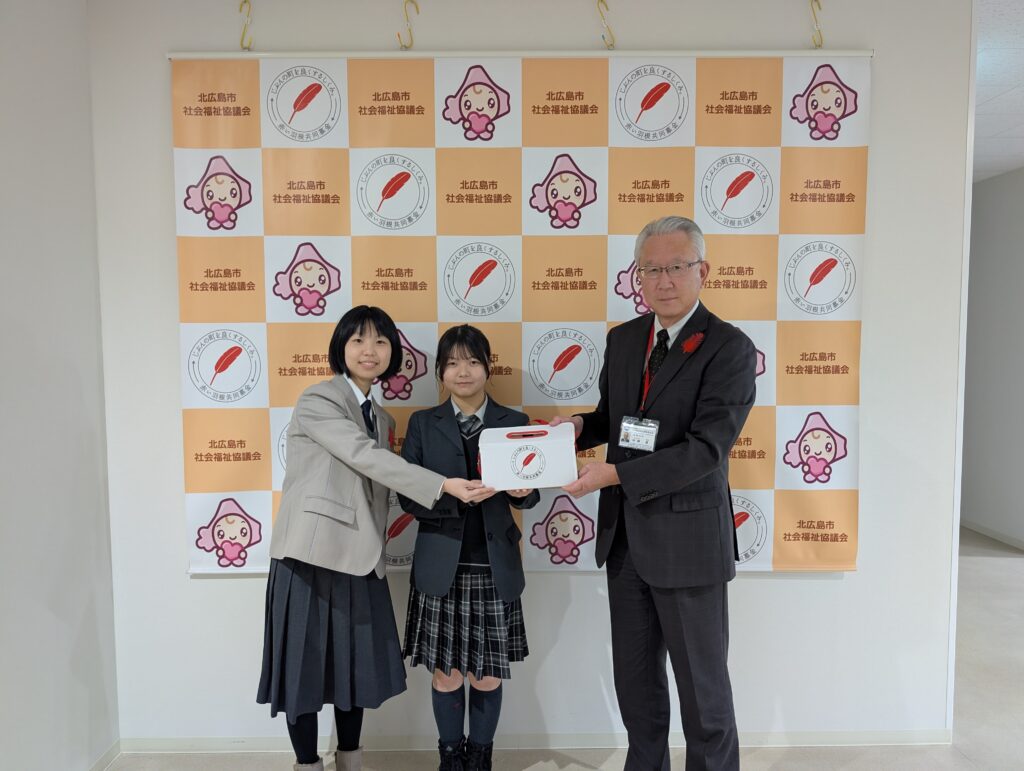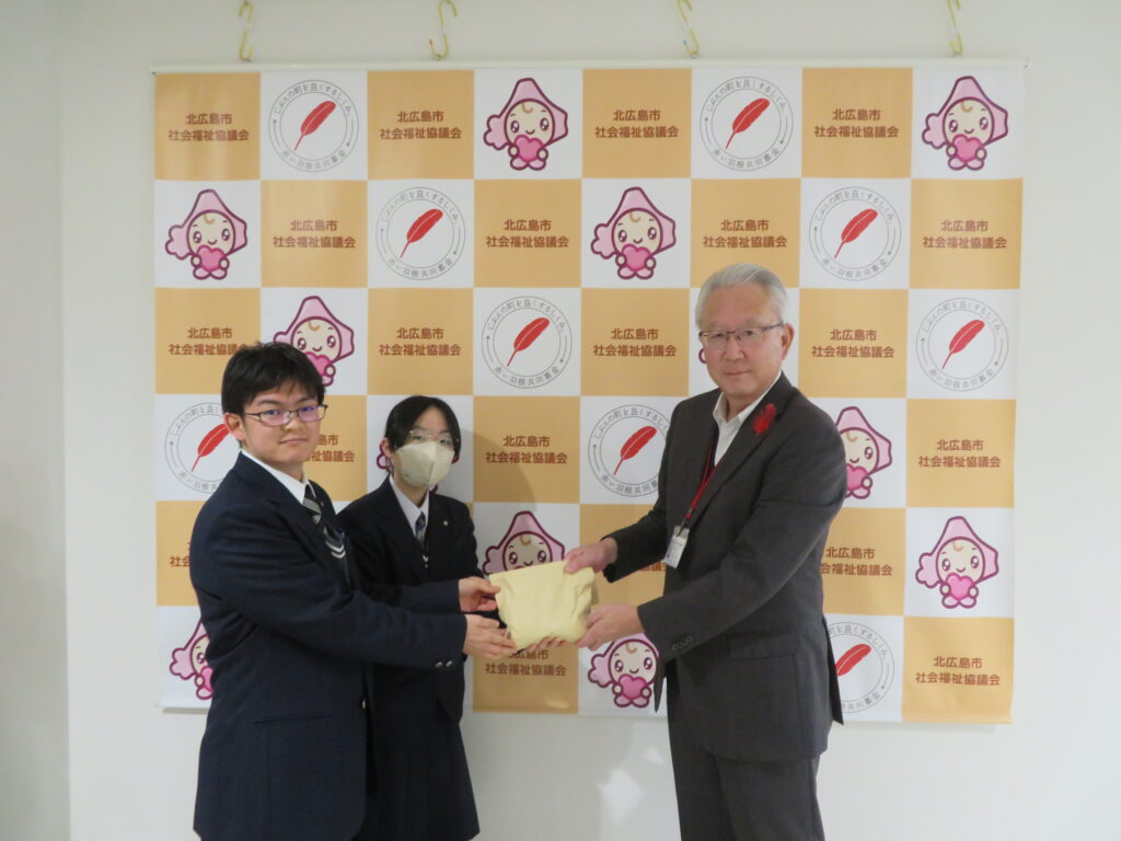 先日、北海道北広島高等学校生徒会の方と札幌日本大学学園ボランティア部の方が学校で集めた赤い羽根共同募金を持参してくださいました。