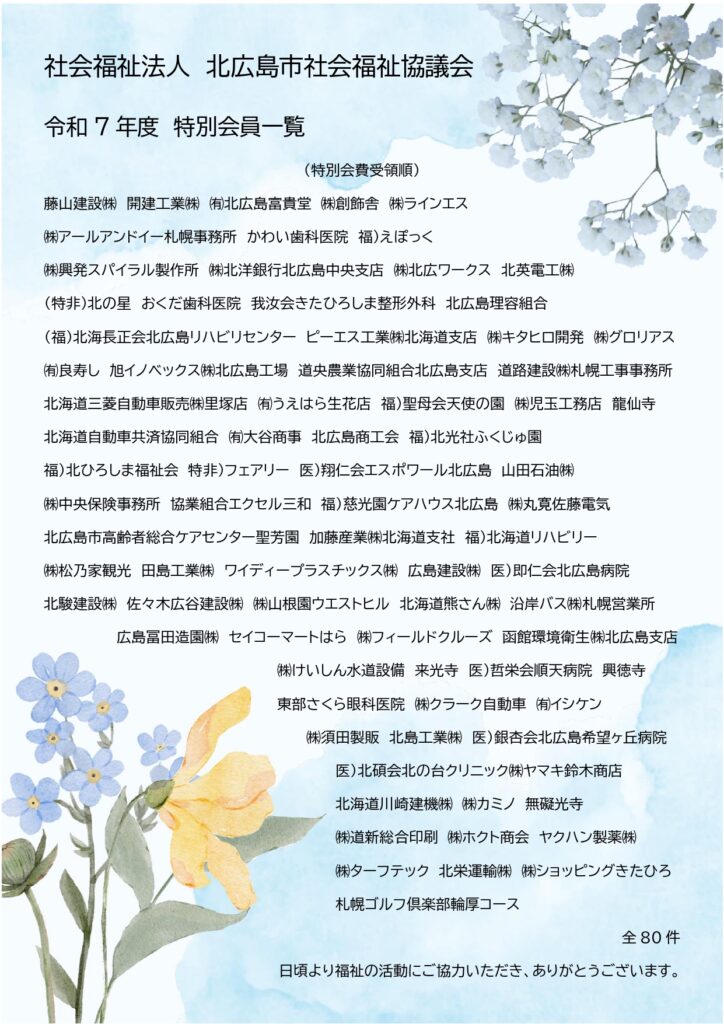令和7年度(令和7年4月~令和8年3月)ご協力のあった賛助会員・特別会員は以下の通りです。