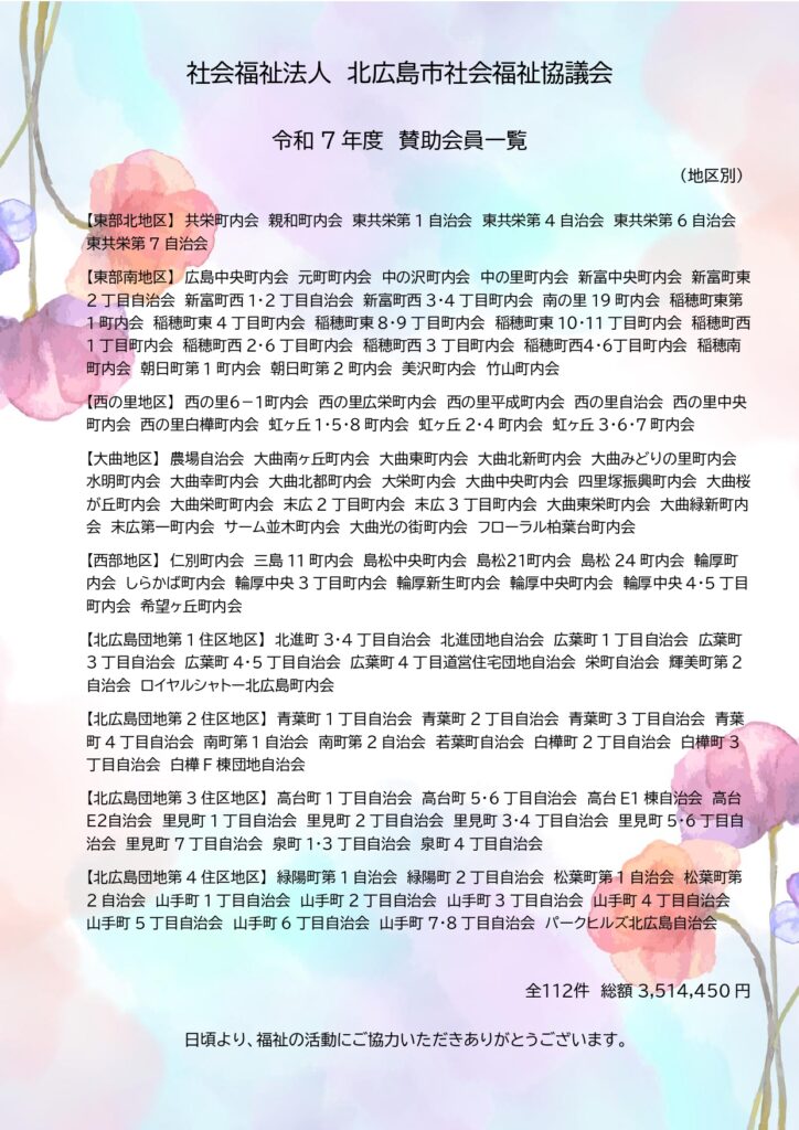 北広島市社会福祉協議会では、地域の支え合い活動を継続的に行っていくために、市民の皆様や法人・企業の方々に活動財源へのご協力をいただいています。 市民の皆様には、自治会・町内会を通じて「賛助会員」として1世帯300円以上、「特別会員」として法人・企業の方々に毎年ご協力いただいています。